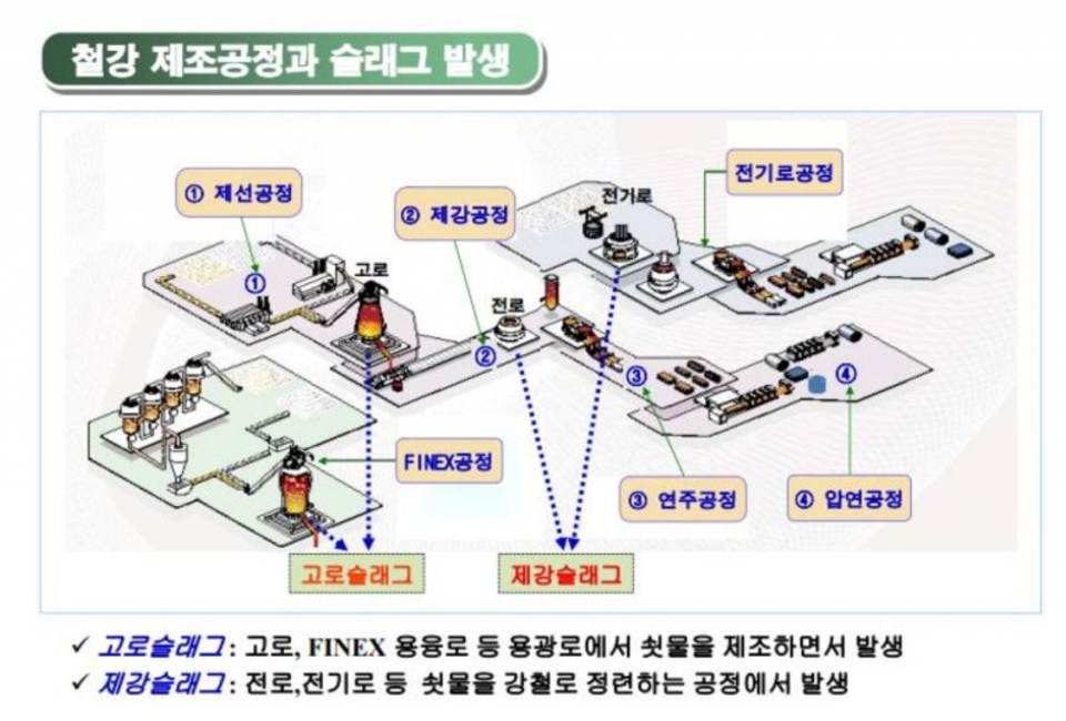 철강 슬래그는 철강 제조공정에서 발생하는 부산물로, 전체 부산물의 약 90%가량을 차지하고 있다. 특히 철강 슬래그는 물리적·화학적 성질이 우수한 친환경 자원으로 천연자원 절약과 환경보전에 기여할 뿐만 아니라, 관련 산업 분야와의 상생에도 이바지하고 있다.