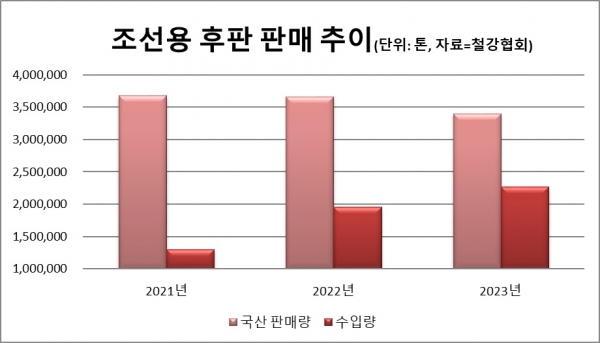 조선용 수요, 저가 수입산에 빼앗겨…2년 동안 수입량 100만 톤 늘어