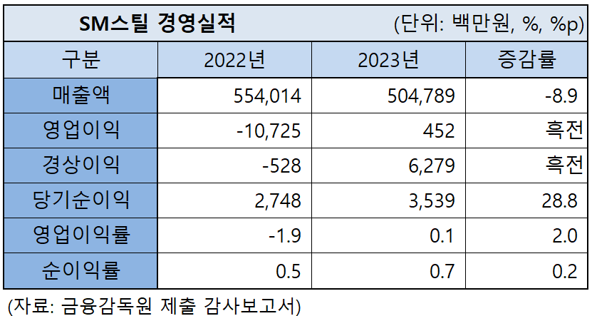 스테인리스 강판 및 스테인리스 후판 전문사 SM스틸의 수익성이 지난해 철강&스테인리스 시장 악화에도 흑자로 전환됐다.
