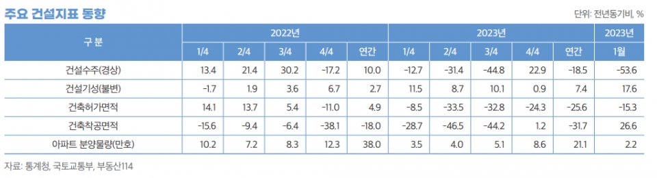 보고서에 따르면 2024년 1월 선행지표인 건설수주는 전년 동월 대비 53.6%, 건축허가면적은 15.3% 감소한 반면 동행지표인 건설기성은 17.6% 늘었으며 건축착공면적도 기저효과 영향으로 26.6% 증가했다.