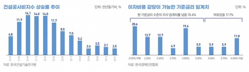 실제 한국경제인연합회가 매출 500대 건설기업을 대상으로 설문조사를 실시한 결과, 이 중 76.4%가 '현 기준금리 수준이 자사 임계치를 넘었다'고 응답했다.