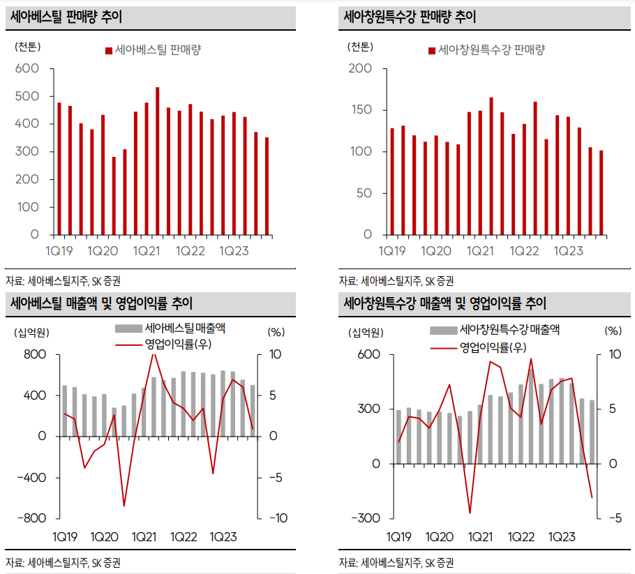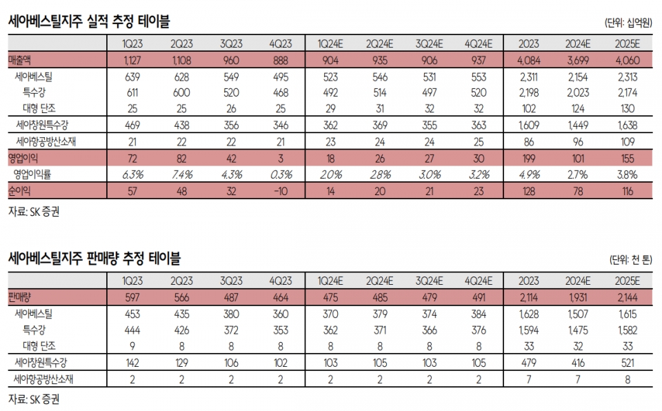 SK증권 이규익 연구원은 2024년 세아베스틸의 매출액이 3조6,984억 원, 영업이익이 1,015억 원으로 전망했다. 각각 전년 대비 9.4%, 48.4% 줄어들 것으로 예상한 것.