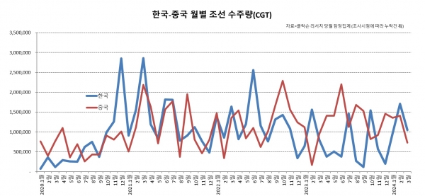 산업부는 “2024년 1분기 세계 수주의 약 44.7%를 점유하면서 국내 조선소 순위가 바로 세계조선소 순위가 되는 조선산업의 신화를 이어 나가고 있다”라며 “1분기 수주량의 경우 우리나라는 449만CGT(표준환산톤수)로 중국(490만CGT) 보다 다소 적지만 전년 동기 대비 한국은 32.9% 증가, 중국은 0.1% 감소해 한국 조선산업은 성장세를 이어 갔다”라고 설명했다.