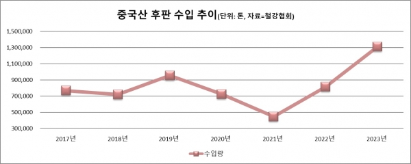 반면 중국산 후판 수입량은 2021년 약 44만톤, 2022년 약 81만 톤에서 지난해 130만 톤으로 급격하게 늘었다. 올해 1분기 기준 수입량도 약 38만 톤을 기록해 전년 대비 10% 늘어난 상황이다. 이와 함께 중국산 블록 직수입량도 증가할 가능성이 높은 것으로 전해진다.
