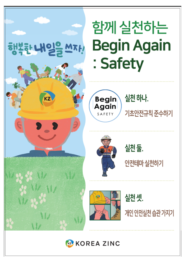 고려아연은 올해 ‘Begin Again : Safety’라는 슬로건을 바탕으로 5개의 안전실천 테마를 선정했다. ▲교통사고 예방 ▲5대 안전사고 예방 ▲건강관리 실천 ▲건전한 생활습관 조성 ▲기초안전 확보 등이다. 이를 전 구성원이 자발적으로 실천할 수 있도록 하겠다는 목표다. 이달부터 전 구성원이 B.A운동의 의미를 이해할 수 있도록 하는 자리를 마련하는 등 성공적인 캠페인을 위한 여정에 돌입했다.