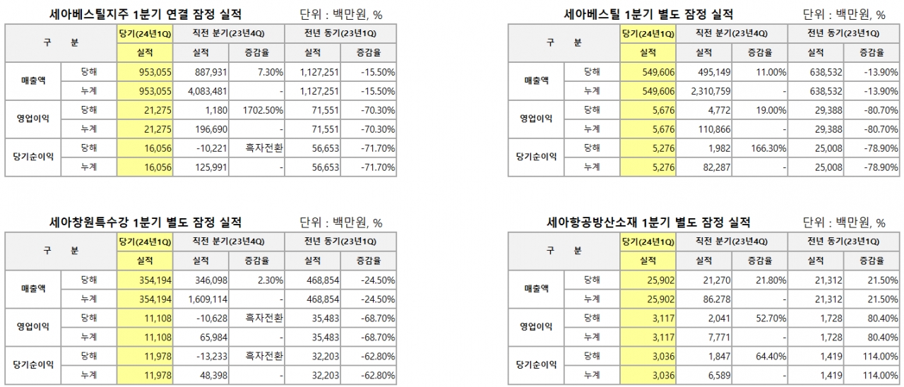 2일, 세아베스틸지주는 1분기 잠정 경영실적으로 매출액 9,530억5,500만 원(연결 기준), 영업이익 212억7,500만 원, 분기순이익 160억5,600만 원을 달성했다고 밝혔다. 각각 전년 동기 대비 15.5%, 70.3%, 71.7% 감소했다.