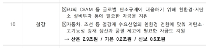 이 중 철강은 유럽연합(EU)의 탄소국경조정제도(CBAM) 등 글로벌 탄소규제 대응에 필요한 친환경·저탄소 설비투자 자금을 지원한다. 아울러 자동차, 조선 등 철강 수요산업의 친환경 전환에 맞춰 저탄소·고기능성 강재 생산과 품질 제고에 필요한 자금도 지원한다.