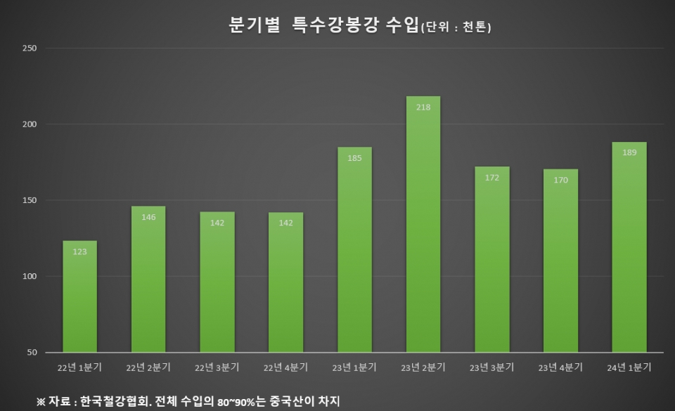 각 업체는 전방 산업 침체로 국내 수요도 부족하지만, 결정적으론 중국산 폭탄 물량에 감산이 불가피했단 반응이다. 특히 지난해부터 중국산 특수강봉강은 국산 탄소강과 합금강보다 톤당 30만~40만 원이나 낮은 가격 차를 유지하고 있다. 국내 제조사와 유통점은 이미 출혈 경쟁에 참여해 적자 수준에 판매하고 있음에도 중국산과 거리를 좁힐 수 없을 만큼 덤핑 수준이 심각하다 보고 있다.