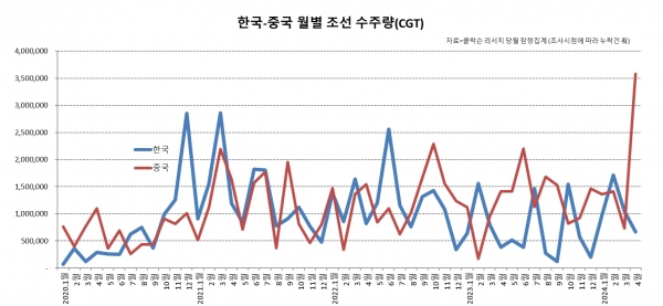 4월 국내 조선사의 수주량은 67만(13척)CGT로 중국 수주량 358만(91척)CGT에 이어 2위를 차지했다. 4월 국내 조선업계의 수주 점유율은 14%에 그쳤다.