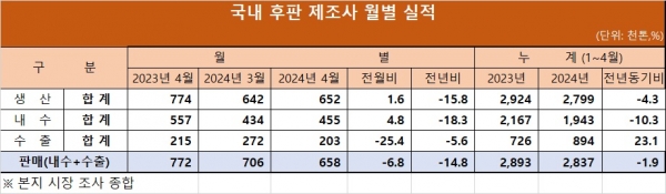 포항제철소 4고로 3차 개수와 제조사별 후판공장 수리 등의 영향으로 생산량은 일부 감소한 것으로 추정된다. 이와 함께 제품 내수 판매도 전년과 비교해 감소한 것으로 나타났다. 업계 관계자는 “비조선용 후판 시황이 여전히 부진한 가운데 조선용 판매도 전방산업 업황 호조에도 불구하고 부진한 상황”이라며 “저가 중국산 후판 유입으로 인해 국산 제품 점유율이 감소하는 추세”라고 설명했다.