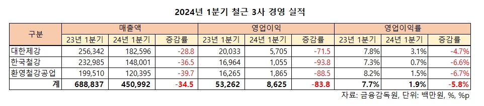 이어 한국철강의 1분기 매출액은 1,480억원으로 전년 동기 대비 36.5% 감소했으며, 영업이익 역시 93.8% 급감한 11억원에 그쳤다. 한국철강의 1분기 영업이익률은 0.7%로 전년 동기(7.3%) 대비 6.6%p 급락했다.