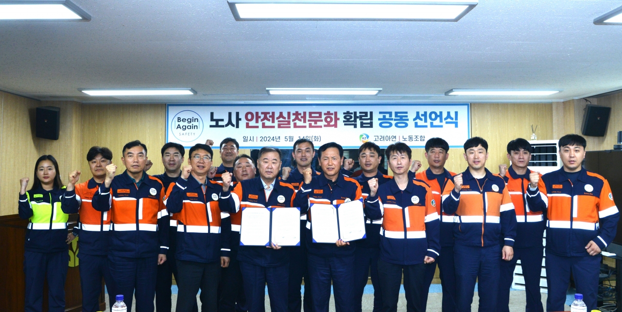 고려아연(회장 최윤범)이 노동조합과 손을 잡고 안전실천 문화 확립을 위한 공동선언문을 발표했다. 안전이 고려아연이 강조하는 핵심 가치이며 구성원 모두 안전을 위해 노력하는 것이 책임 경영으로 이어진다는 내용을 선언문에 담았다.