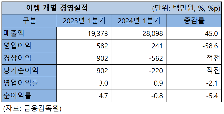 다만 이렘은 분기순손실이 2억2천만 원으로 전년 동기 9억 원 흑자에서 적자 전환을, 직전 분기 24억 원 적자에서 적자 규모 축소 등을 기록했다. 이에 영업이익률은 1% 수준, 순이익률은 -1% 수준이 됐다. 아울러 부채비율이 246.9%로 증가했다.