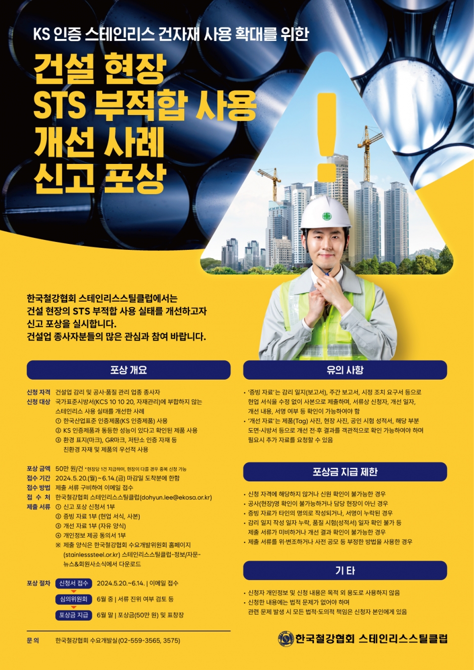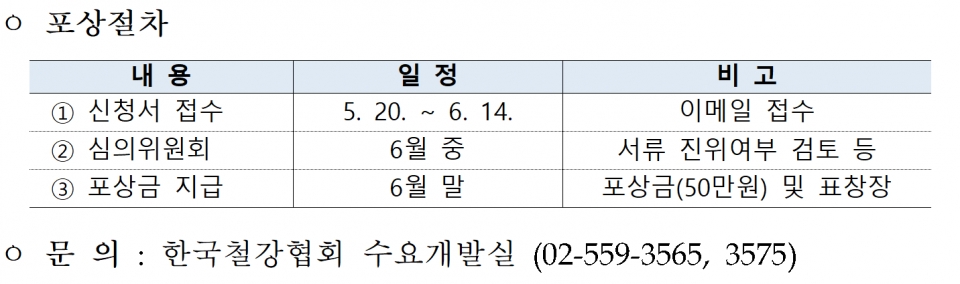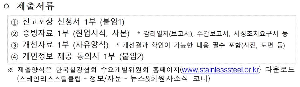 제출에 필요한 서류는 신고포상 신청서 1부와 증빙서류(감리일지, 주간보고서, 시정조치요구서 등), 개선 자료(개선 결과 확인이 가능한 사진 도면 등 내용 필수 포함), 개인정보 제공 동의서 등이다. 이들 서류의 제출 양식은 한국철강협회 수요개발위원회 홈페이지(www.stainlesssteel.or.kr//스테인리스스틸클럽–정보/자문–뉴스&회원사소식 코너)에서 확인할 수 있다. 보다 자세한 문의사항이 있을 경우 클럽 사무국(02-559-3565, 3575)으로 문의하면 된다.