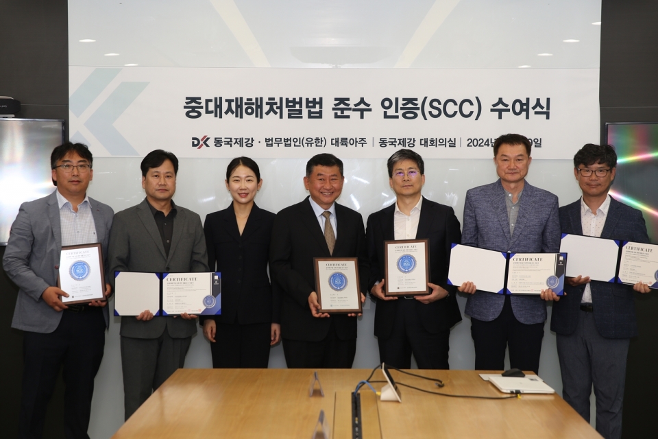 동국홀딩스는 동국제강이 29일 법무법인 대륙아주와 서울 수하동 본사에서 '사내 수급사 중대재해처벌법 준수 인증(SCC) 수여식'을 가졌다고 이날 밝혔다.