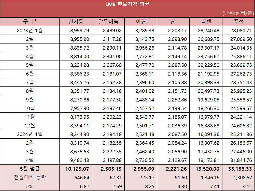 [표]LME 비철금속 5월 평균가격(데이터 수정)