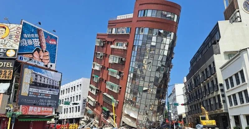 2024년 4월 3일 대만 동부 화롄현을 강타한 규모 7.2의 강진 여파로 건물이 기울어져있다
