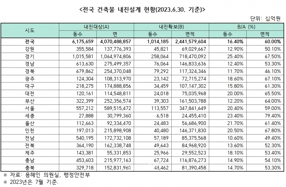 지난해 기본소득당 용혜인 의원이 국토교통부로부터 제출받은 '2023년 전국 건축물 내진설계 현황자료'를 보면 국내 내진설계대상 건축물 617만5,659동 가운데 내진성능 확보가 이뤄진 건축물은 단 101만4,185동으로 전체 16.4%에 그쳤다.