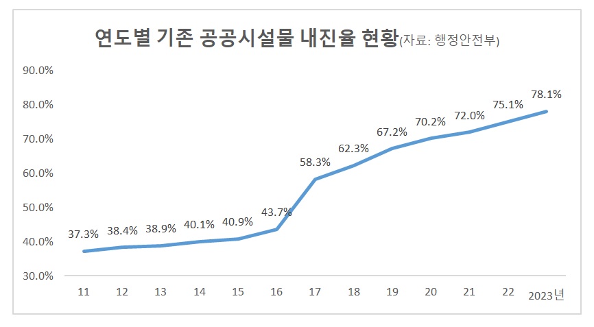 우리나라는 2000년 이후 건축물의 내진설계 의무화가 본격화됐다. 신축 건물과 주요 공공시설에 내진설계가 반영돼 꾸준히 내진율이 반영되고 있다.