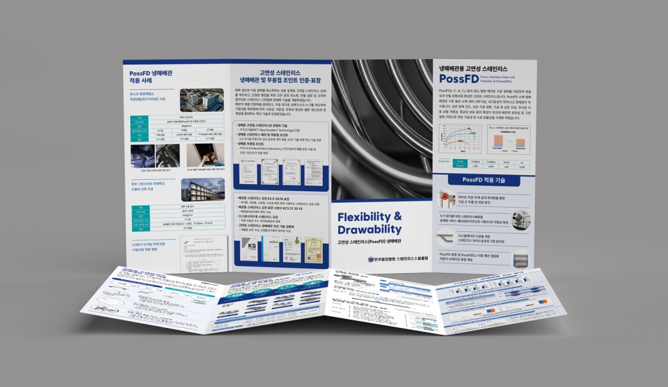 리플렛 형태로 제작된 이번 홍보자료에는 포스코 고유 개발강인 PossFD의 특성과 비교 우위 등을 담고 있다. 특히 스테인리스를 사용한 냉매배관 적용을 위한 고연성 스테인리스 냉매배관 조관 기술(㈜대천)과 강관(파이프) 직경-두께 최적화 기술 및 원터치 시공 가능한 무용접 조인트(㈜에버테크 코퍼레이션) 기술 등을 함께 게재했다.