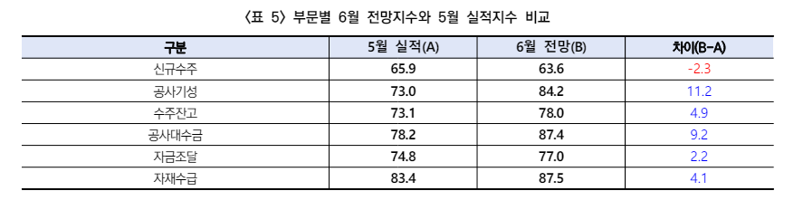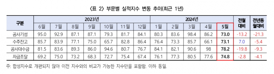 부문별로 살펴보면 5월 신규수주지수는 65.9로 부문별 지수 중 최하위를 기록했다. 공사기성(73.0)과 공사대수금(78.2)도 전월 대비 각각 13.2p, 19.8p 하락하며 1년래 최저 수준으로 떨어졌다.
