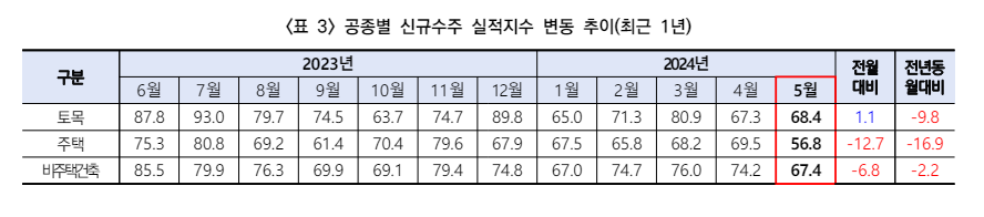 공종별 신규수주의 경우 토목지수(68.4)가 기저효과로 전월 대비 1.1p 상승한 반면 주택지수(56.8)와 비주택건축지수(67.4)는 각각 12.7p, 6.8p 떨어지며 큰 폭 하락했다.