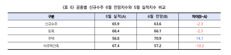 6월 CBSI는 전월 대비 5.3p 상승한 73.0로 전망됐다. 다만 6월에도 신규수주 어려움은 지속되며 특히 비주택건축 하락이 전체 신규수주 하락을 야기할 것으로 건산연은 내다봤다.
