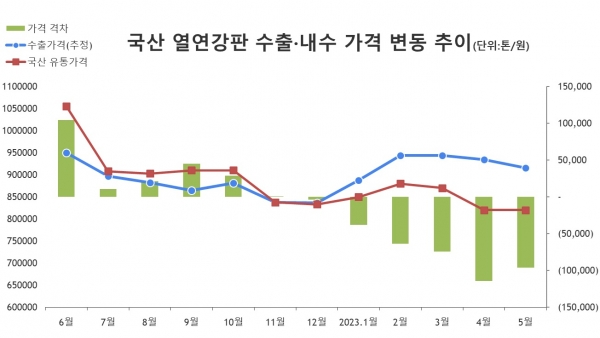이에 5월 국산 열연강판 수출가격은 내수 유통가격 대비 톤당 10만 원 가까이 높은 것으로 집계됐다. 1월부터 3월까지 국산 열연강판 수출가격은 내수 가격 대비 톤당 3만7천~7만4천 원 높은 수준을 나타냈으나, 4월 이후 환율 변동과 내수 유통가격 급락으로 인해 가격 격차는 크게 벌어졌다.