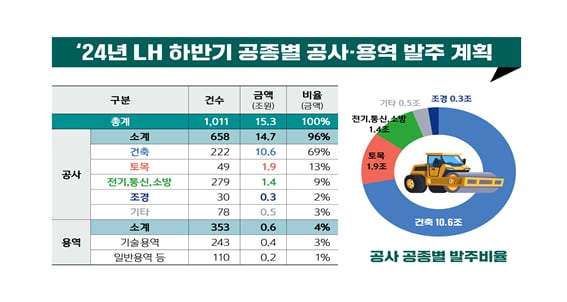 LH는 민간 건설경기 활성화를 위해 하반기 15조3,000억원을 발주하고 이 가운데 9조4,000억원을 공공주택 건설공사 분야에 발주해 주택공급 확대를 통한 부동산 시장 안정에 집중할 계획이다.