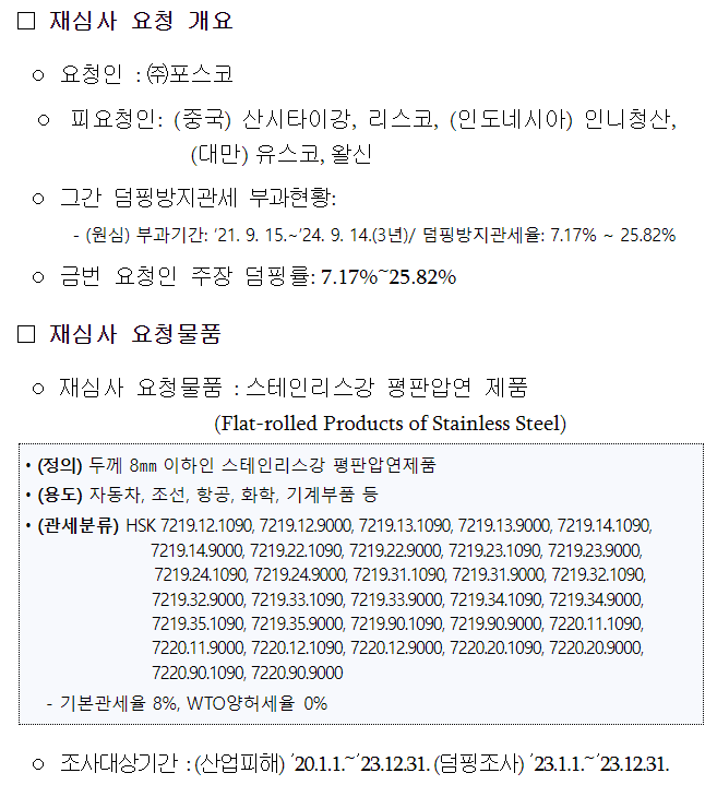 3개국 STS 반덤핑 조사 건은 중국의 산시타이강과 리스코, 인도네시아의 인니청산, 대만의 유스코, 왈신 등을 대상으로 진행되고 있다. 2021년 원심은 3년간 업체별로 7.17%~25.82% 반덤핑 관세를 부과했고 조사 대상 업체 중 일부는 정부와 수출 가격 인상 약속으로 이를 대신했다. 포스코 등 국내 STS 생산자들은 원심과 같은 7.17%~25.82% 관세 부과를 요청했다. 또한 이번 재심을 통해 관세 부과 기간을 종전 3년 주기에서 5년으로 확대 적용해달라고 한 것으로 알려졌다.
