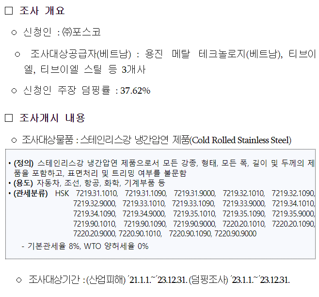 베트남산 반덤핑 조사는 산업피해 조사 기간이 2021년 1월 1일에서 2023년 12월 31일로, 덤핑조사 기간이 2023년 1월 1일에서 12월 31일로 결정됐다. 올해 4월 포스코의 조사 신청으로 시작된 베트남산 조사는 5월 30일 조사 개시 결정으로 7월 이번 공청회가 열렸으며 마찬가지로 8월부터 서면 검토 및 본조사가 진행된다.