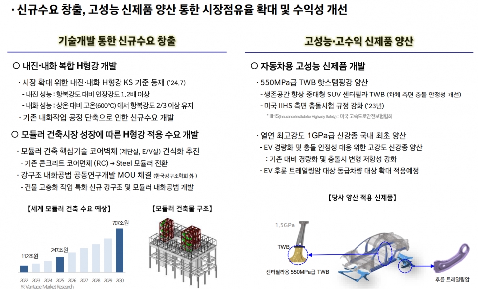특히, 회사는 기술개발 통한 신규수요 창출에 적극 뛰어들 계획이다. 현대제철은 ‘내진·내화 복합 H형강’이 올해 7월 한국산업표준(KS) 기준에 등재된 점을 언급하며 해당 시장 개척에 적극 나설 것임을 밝혔다.