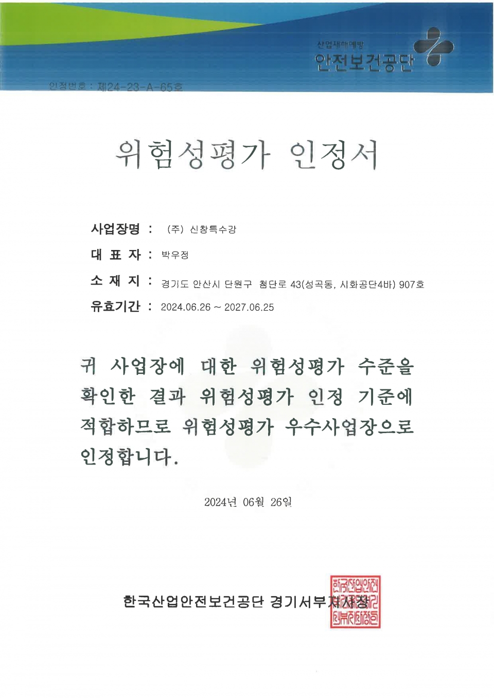 신창특수강은 직원들의 작업 안정성과 제품의 적기 납기를 위해 사업장 위험성에 대한 투자와 노력을 기울여 온 노력으로 이번 위험성평가 우수사업장 인정서를 획득하게 됐다. 회사는 이전에도 환경경영시스템의 우수성을 확인하는 ISO 14001 인증과 품질경영시스템과 관련한 ISO 9001 인증 등을 얻은 바 있다.