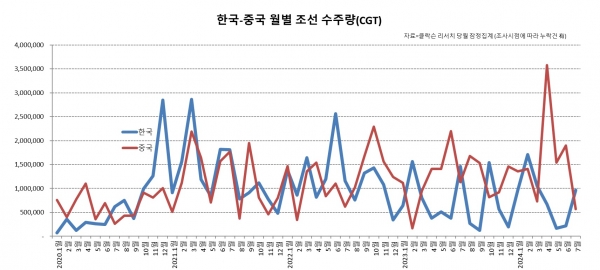 7월 국내 조선사의 수주량은 96만(18척)CGT로 중국 수주량 57만(30척)CGT를 큰 폭으로 제치고 1위를 차지했다. 7월 국내 조선업계의 수주 점유율은 40%를 나타냈다.