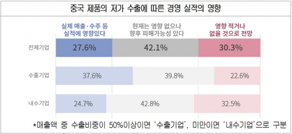 또한 ‘현재까지는 영향이 없으나 향후 피해 가능성이 있다’고 우려를 나타낸 기업도 42.1%에 이르렀다. 특히 중국 공산품의 저가 공세로 피해를 보고 있다는 수출기업이 37.6%로 내수기업 24.7%보다 높았다.