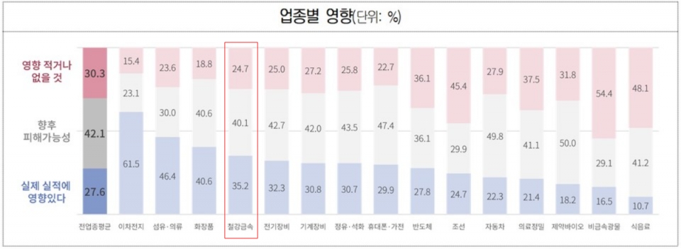 업종별 집계에서 철강·금속업은 35.2%가 중국산 저가재 유입으로 경영 실적에 영향을 받았다고 답했다. 이차전지 61.5%, 섬유·의류업 46.4%, 화장품 40.6% 다음으로 네 번째로 높았다. 반면 비금속광물업은 16.5%, 자동차는 22.3%, 전기장비 32.3% 등으로 일부 연관 산업은 철강금속업보다 적은 중국산 피해 응답률을 기록했다.