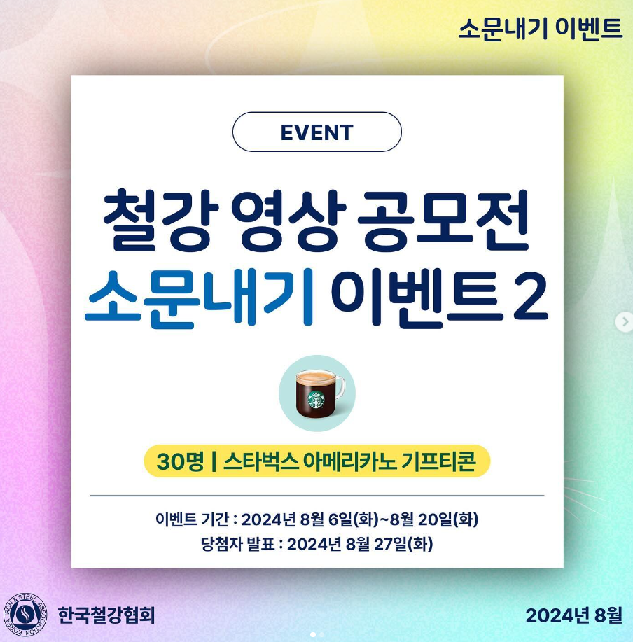 한국철강협회가 ‘철강 영상 공모전’ 소문내기 이벤트를 연다. 간단한 참여 방법을 통해 참여한 30명에게 스타벅스 아메리카노 기프티콘을 수여할 예정이다.