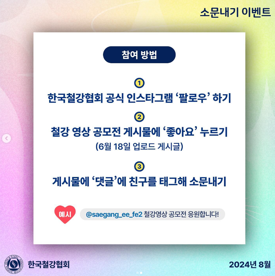 한국철강협회는 지난 6일부터 오는 20일까지 영상 공모전 소문내기 이벤트를 개최한다고 밝혔다. 이벤트 참여 방법은 ➀ 한국철강협회 공식 인스타그램 ‘팔로우’ 하기, ➁ 철강 영상 공모전 게시물에 ‘좋아요’ 누르기(6월 18일에 업로드된 ’철강 영상 공모전 개최‘ 게시글), ➂ 게시물에 ‘댓글’에 친구를 태그해 소문내기 등 총 3단계다.