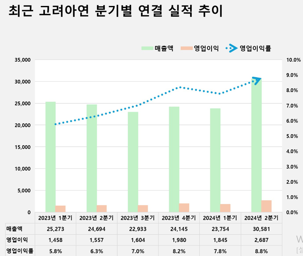 고려아연은 올해 2분기 연결기준 매출액과 영업이익으로 각각 3조581억원, 2,687억원을 기록했다고 7일 밝혔다. 전년 동기 대비 매출액은 23.8%(5,887억원), 영업이익은 72.6%(1,130억원) 늘었다. 직전 1분기와 비교해선 매출액 28.7%(6,827억원), 영업이익 45.6%(842억원) 증가했다. 분기 기준 매출액이 3조원을 넘은 건 올해 2분기가 사상 처음이다.