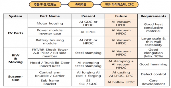 2. 다이캐스팅 분야로 시각을 좁힌다면 테슬라로부터 시작된 원가절감/경량화의 혁신적 공법으로 기가프레스가 최근 몇 년간 다이캐스팅만이 아닌 자동차 부품업 전체의 최대 화두로 거론 되고 있지만, 현실적으로 기가프레스를 운영할 수 있는 다이캐스팅 회사는 막대한 투자를 감당할 수 있는 거대 자동차 회사 또는 초대형 다이캐스팅 회사들만이 감당할 수 있고 대부분의 중소 다이캐스팅 업계는 다른 시각으로 다이캐스팅의 미래를 바라보아야 한다. 기가프레스의 도입으로 기존 다이캐스팅에서는 불가능하다고 여겨졌던 자동차 구조재(Structure Parts)의 다이캐스팅 공법으로의 품질 확보 가능성이 검증 되었고, 이를 필두로 현재 지속적으로 원가 및 경량화를 통한 LCA감소의 차원에서 철강, 단조, 중력/사형 주조 등의 공법으로 생산되던 제품의 다이캐스팅으로의 공법 전환이 매우 신속하고 광범위하게 일어나고 있는 상황을 제조 현장에서 매우 빈번하게 확인 할 수 있다. 즉 가가프레스의 도입으로 중소다이캐스팅의 영역이 감소되는 것이 아니라 기존 타 공법으로 생산되던 제품의 다이캐스팅 공법으로의 전환이라는 순기능이 더욱 두드러지는 현실이다. 이러한 경향으로 인하여 다이캐스팅은 제 2의 황금기에 들어섰다고 판단하는 것이 결코 무리가 아니라고 여겨지고 있다.
