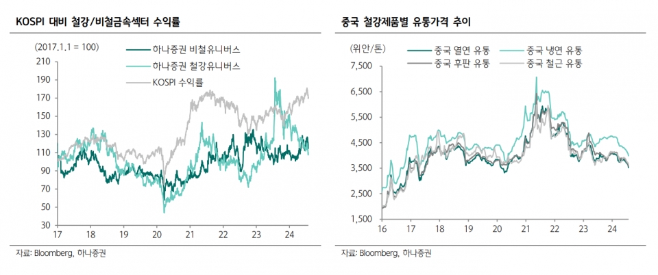 하나증권 박성봉 연구원은 중국 철강 유통 가격이 비수기 수요 부진과 주요국들의 중국산 무역 규제 확대 영향으로 약세가 지속됐다며 7월 마지막 주에 열연강판이 전주 대비 1.7% 하락한 톤당 3,466위안, 냉연강판이 전주 대비 1.6% 하락한 톤당 3,927위안, 철근이 전주 대비 1.6% 하락한 3,608위안에 거래됐다고 설명했다. 산업용 주요 금속 가격도 중국 경기지표 부진으로 니켈을 제외한 대부분 제품에서 하락 마감했다.