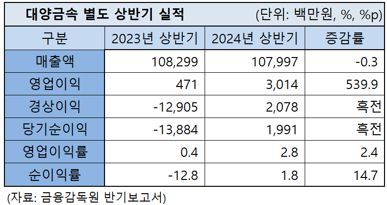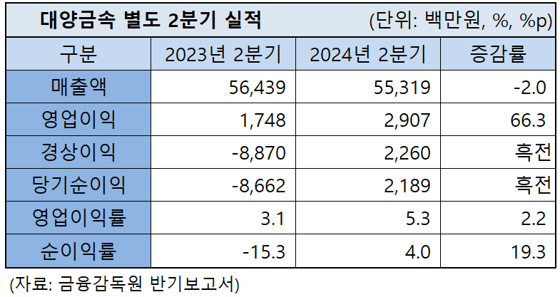대양금속은 올해 상반기 별도 매출액으로 1,079억 9,700만 원을 달성했다. 전년 동기 대비 0.3% 소폭 감소했다. 2분기 매출은 553억 1,900만 원으로 1분기보단 약 26억 원 늘었지만 전년 동기보단 2% 감소했다.