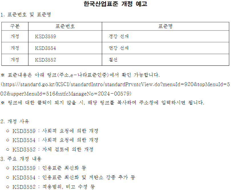 한편, 국표원은 KS D 3552(철선)과 KS D 3554(연강 선재), KS D 3559(경량 선재) 등의 표준도 사회적 요청 및 자체 검토로 인용표준을 최신화하고 저탄소 강종을 추가, 적용 범위를 수정하는 등 개정작업에 나설 계획이라고 전했다.