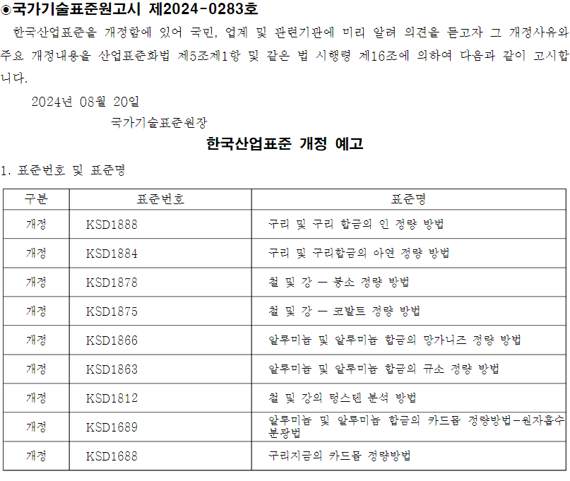 20일, 국표원은 국가기술표준원 고시를 통해 KS D 1808(철 및 강 니켈 분석방법)과 KS D 1755(금속 규소의 분석 방법), KS D 1757(아연지금의 카드뮴 정량방법), KS D 1756(아연지금의 납 정량방법) 등을 자체 검토 결과 폐지하기로 결정했다고 밝혔다.