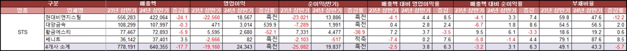 금융감독원 자료에 따르면 올해 상반기 주요 STS 강판 상장 4개사(현대비앤지스틸, 대양금속, 황금에스티, 쎄니트)의 총매출액은 6,403억 5,500만 원(개별 또는 별도 실적 합/이하 동일)을 기록했다. 전년 동기 대비 17.7% 급감했다.