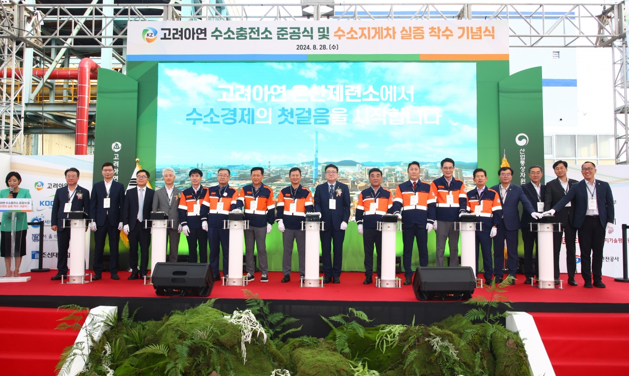 △고려아연은 28일 온산제련소에서 산업통상자원부(이하 산업부)와 함께 수소지게차용 수소충전소 준공식을 개최한 가운데 최남호 산업부 제2차관과 김두겸 울산광역시장, 이순걸 울주군수, 박기덕 고려아연 사장 등 내외빈이 수소충전소 준공을 기념하는 버튼을 누르고 있다.