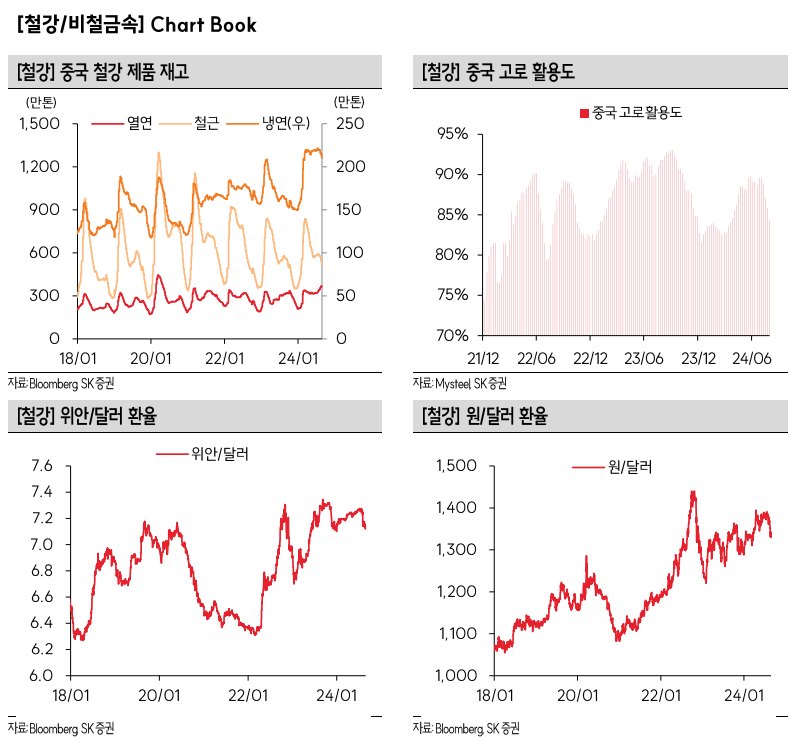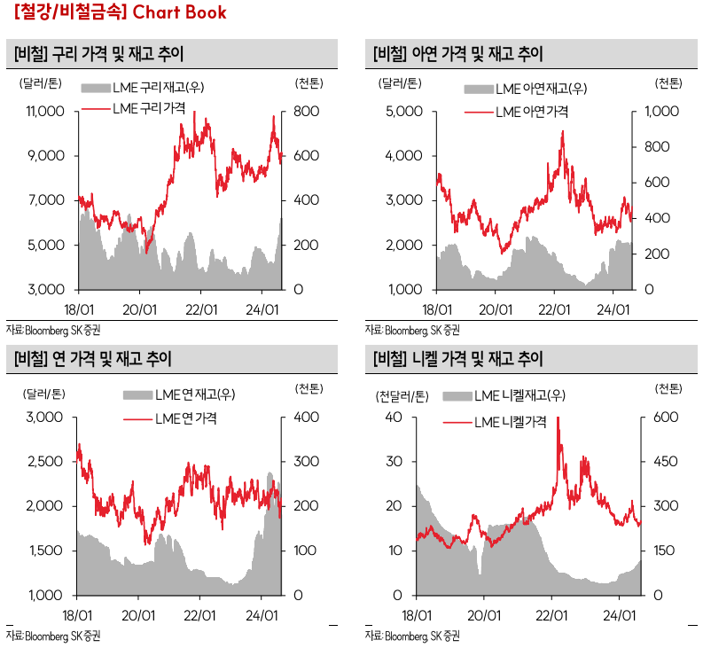 SK증권 이규익 연구원이 중국의 철근 재고가 여전히 많은 상황이라 지적했다. 철강금속 업종 추천종목(TOP PIKCS)로는 풍산과 고려아연을 산정했다.