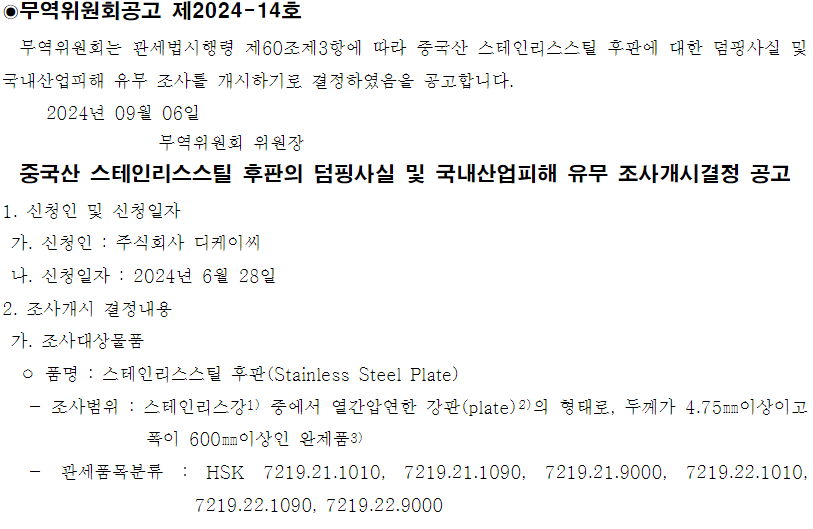 6일, 무역위원회는 국내 STS 후판 사업자인 디케이씨의 청원을 받아드려 중국에서 생산된 스테인리스스틸 후판(Stainless Steel Plate)에 대한 덤핑 사실 및 국내산업 피해 유무 조사를 개시하기로 결정했다고 밝혔다. 디케이씨는 이 같은 청원을 지난 6월 28일 제출한 것으로 나타났다.