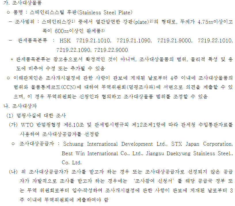 이번 조사 대상은 스테인리스강 중에서 열간압연한 강판 형태의 제품으로 두께가 4.75mm 이상, 폭이 600mm 이상인 완제품이다. 관세품목분류 상으로 HSK 7219.21.1010, 7219.21.1090, 7219.21.9000, 7219.22.1010, 7219.22.1090, 7219.22.9000 등에 해당한다.