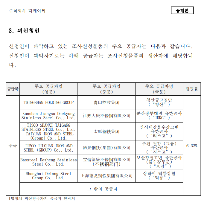 무역위원회는 이번 반덤핑 조사 대상 기업으로 중국의 Schuang International Development Ltd(덕룡)., STX Japan Corporation, Best Win International Co., Ltd., Jiangsu Daekyung Stainless Steel., Co. Ltd(쿤산장쑤성 유한공사/JDKC) 등을 지정했다. 이 중 ‘STX Japan Corporation’은 우리나라 무역상사 STX의 일본 도쿄법인으로 알려졌다. STX는 중국 상하이에도 해외법인을 운영 중이다. 청원자인 디케이씨가 청원서에서 현지 주요 공급사로 지적한 칭산(청산)강철그룹, 티스코, 지스코, 보강 등은 조사 대상 명단에 없었다.